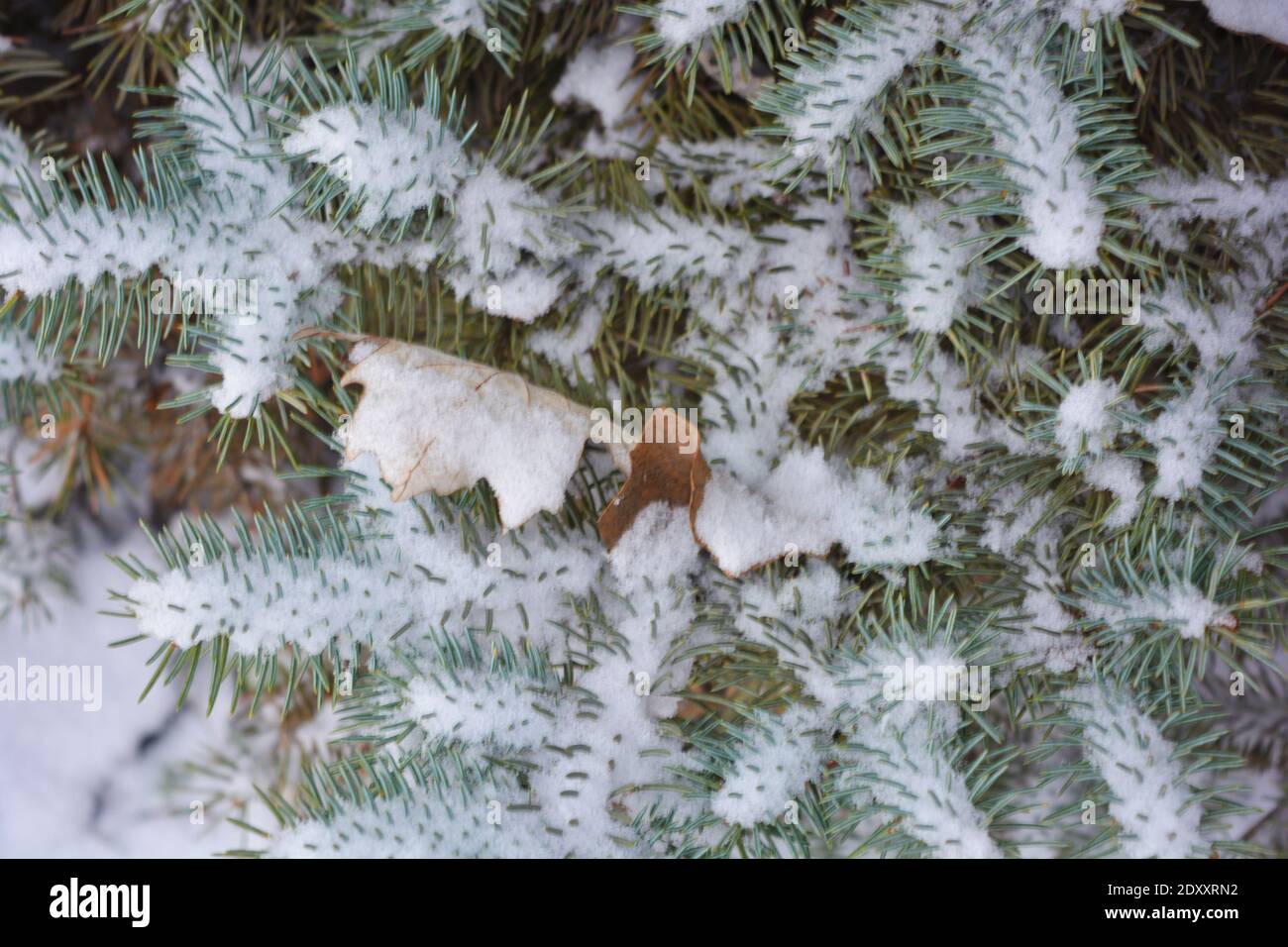 Beautiful Green Branches Of A Christmas Tree Spruce With Small Thorns And With Dry Yellow November Fallen Leaves From The Tree Covered With White Stock Photo Alamy